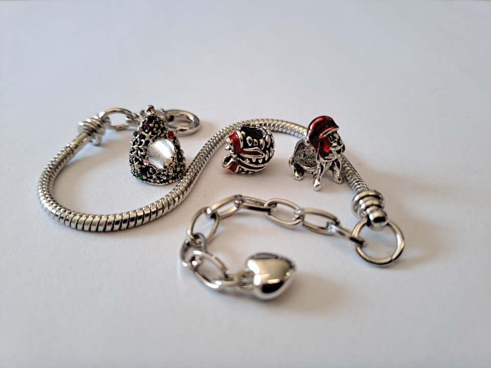 Billede 1a + ab: Gør-det-selv julekalender armbånd. Kemikalieinspektionen har fundet at dele af smykket indeholder 30 % cadmium, 0,3 % bly samt frigiver 0,92 µg/cm2/uge nikkel.